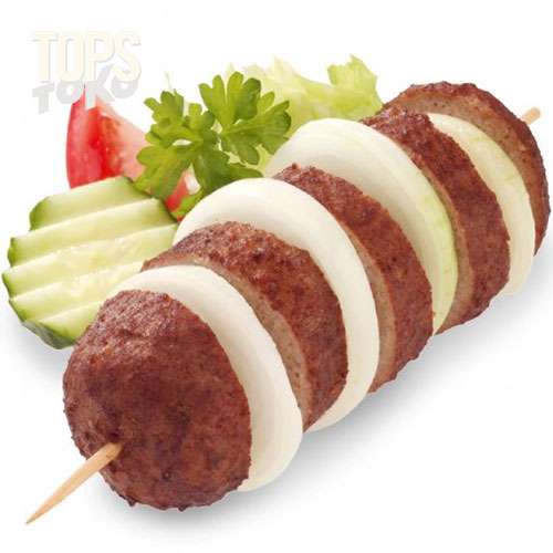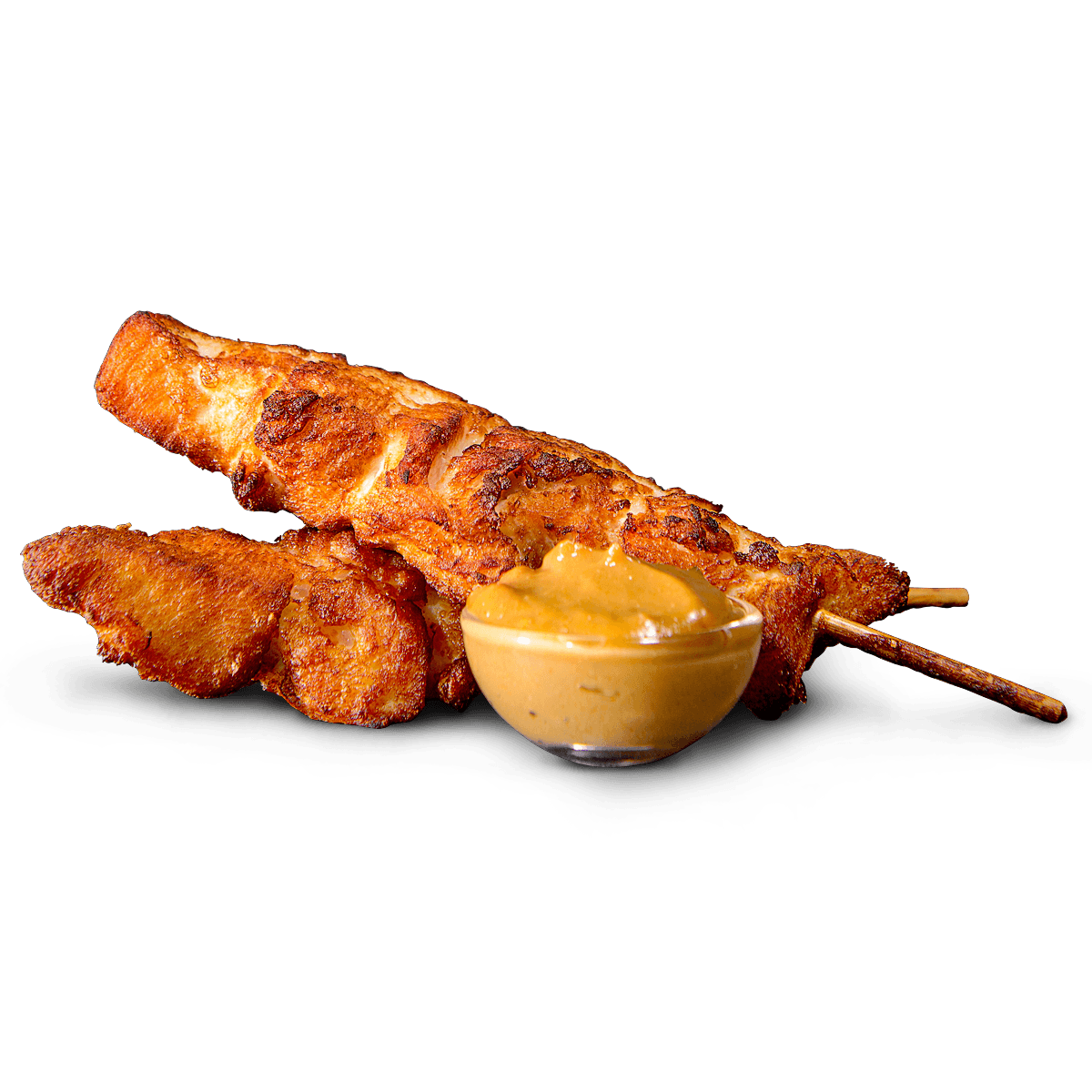 Kipsaté met satésaus en gebakken uitjes, ambachtelijke friet kroepoek en atjar