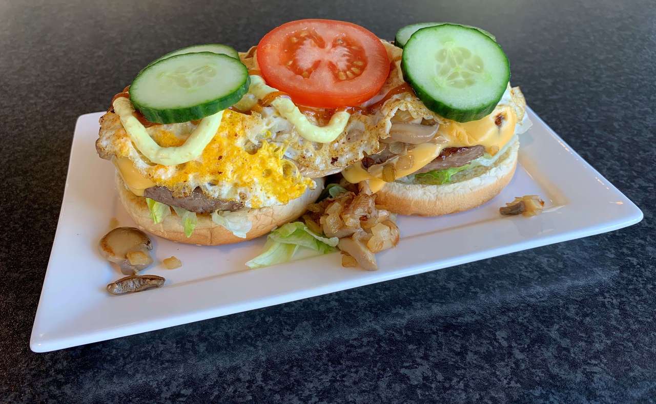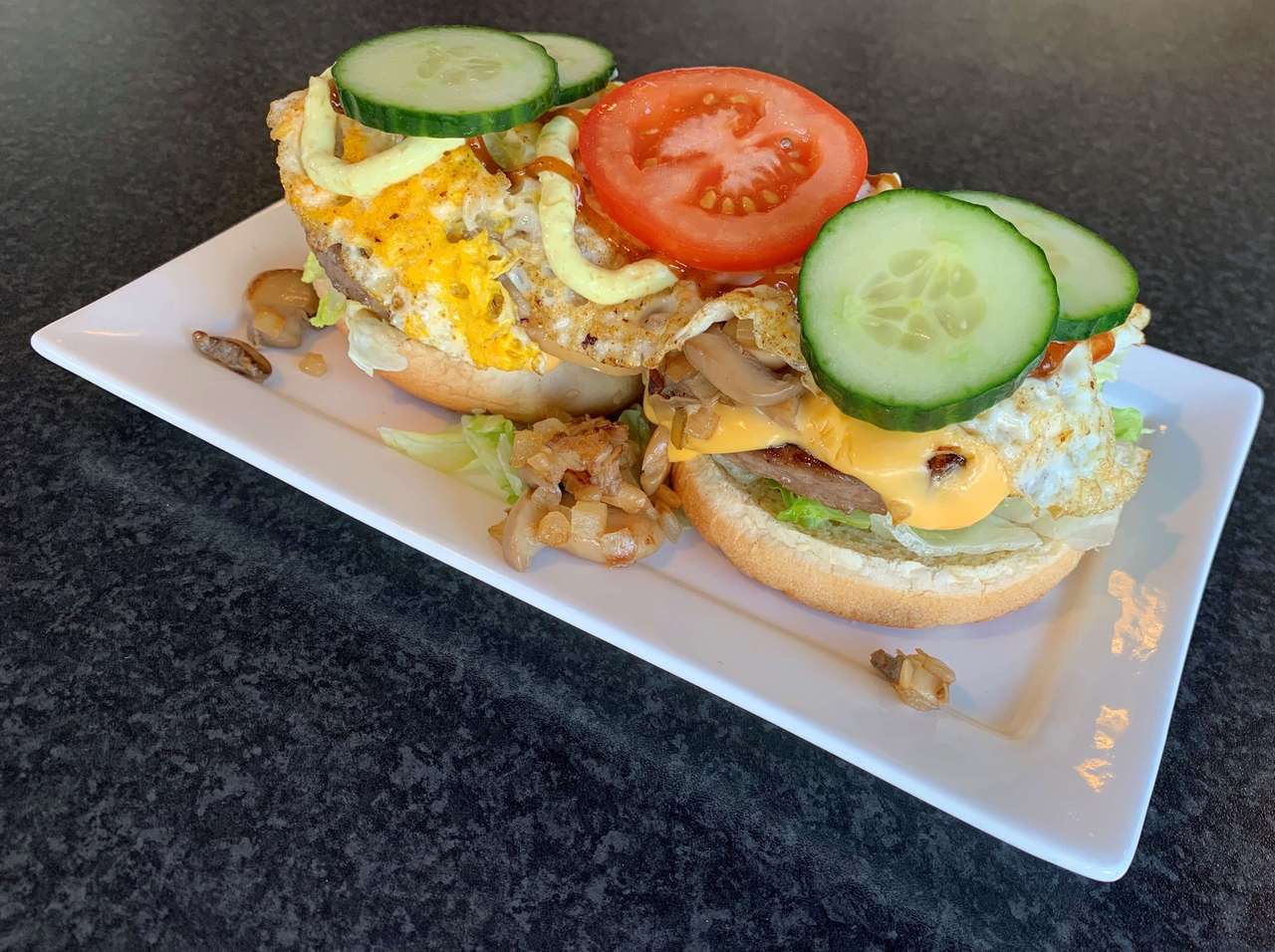Dubbele hamburger met sla augurk ui, champignon, kaas, gebakken ei en onze speciale saus!