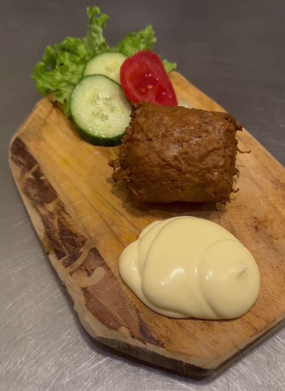 Loempia, ambachtelijke friet , kroepoek atjar satesaus en gebakken uitjes