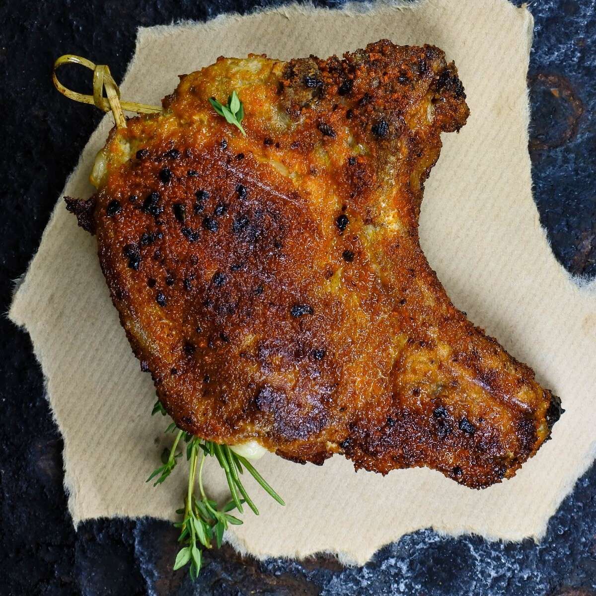 Gepaneerde speklapjes van de slager met ambachtelijke friet en salade
