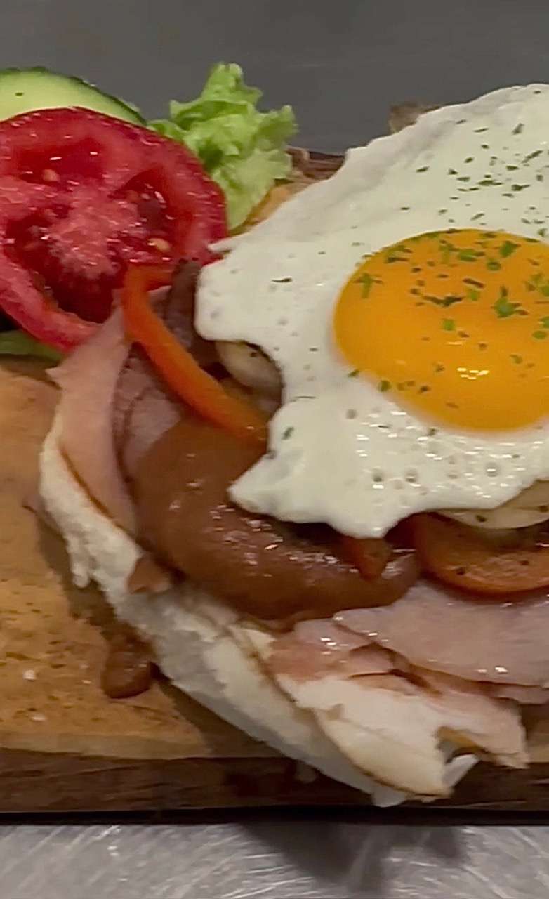 2 snee brood, 3 eieren, ham& kaas, gebakken ui & champignon